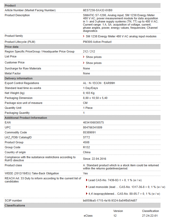 | SIMATIC S7-1200, Analog input, SM 1238 Energy Meter 480 V AC, power measurement module for data acquisition in 1- and 3-phase supply systems (TN, TT) up to 480 V AC; Current range: 1 A, 5A; acquisition of voltage, current, phase angles, power, energy values, frequencies; Channel diagnostics |