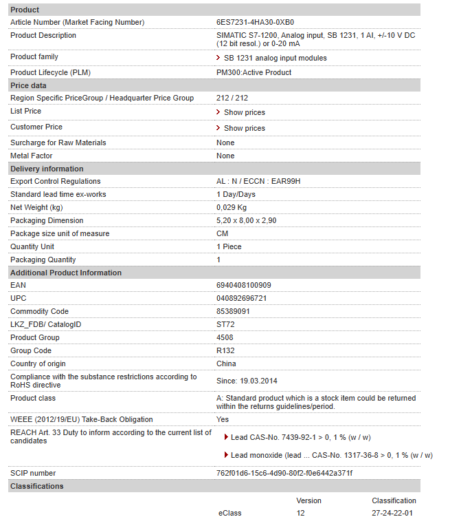| SIMATIC S7-1200, Analog input, SB 1231, 1 AI, +/-10 V DC (12 bit resol.) or 0-20 mA |