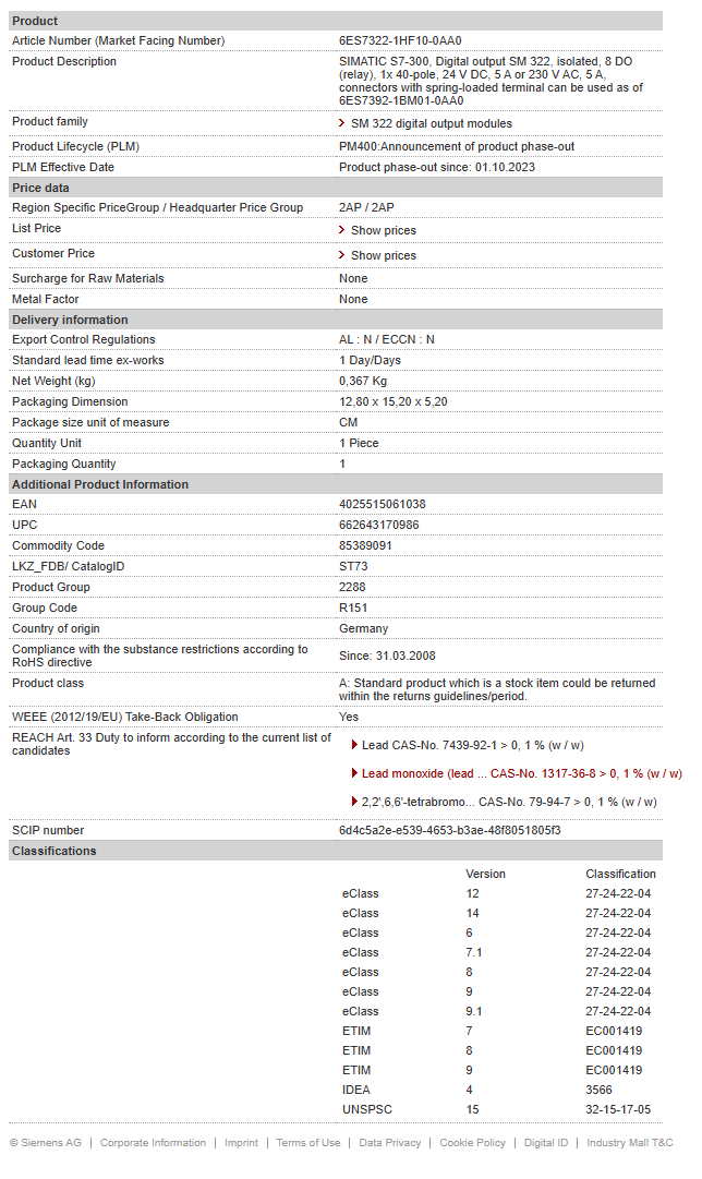 | SIMATIC S7-300, Digital output SM 322, isolated, 8 DO (relay), 1x 40-pole, 24 V DC, 5 A or 230 V AC, 5 A, connectors with spring-loaded terminal can be used as of 6ES7392-1BM01-0AA0 |