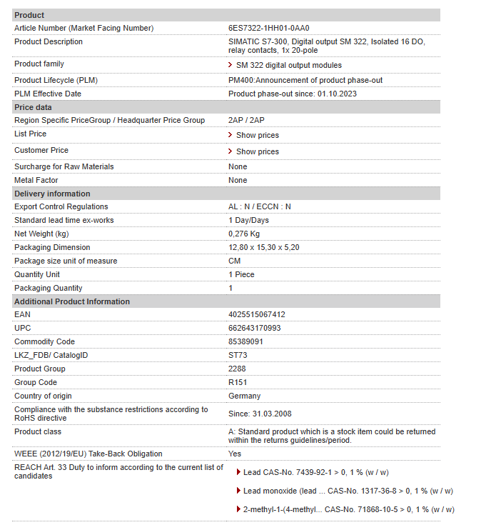 | SIMATIC S7-300, Digital output SM 322, Isolated 16 DO, relay contacts, 1x 20-pole |
