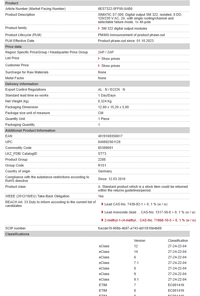 | SIMATIC S7-300, Digital output SM 322, isolated, 8 DO, 120/230 V AC, 2A, with single rooting/channel and selectable failure mode, 1x 40-pole |