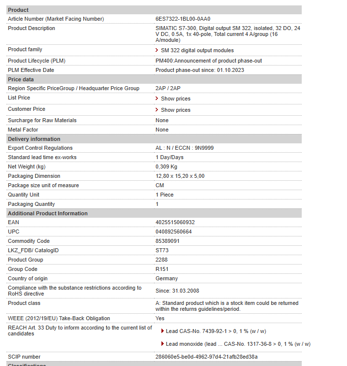 | SIMATIC S7-300, Digital output SM 322, isolated, 32 DO, 24 V DC, 0.5A, 1x 40-pole, Total current 4 A/group (16 A/module) |