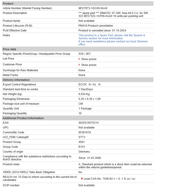 | *** spare part *** SIMATIC S7-300, fuse kit 6.3 A; for SM 322 6ES7322-1CF00-0AA0 10 units per packing unit |