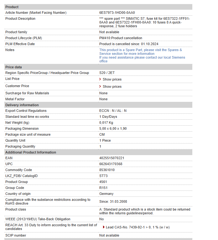 *** spare part *** SIMATIC S7, fuse kit for 6ES7322-1FF01-0AA0 and 6ES7322-1FH00-0AA0: 10 fuses 8 A quick-response, 2 fuse holders