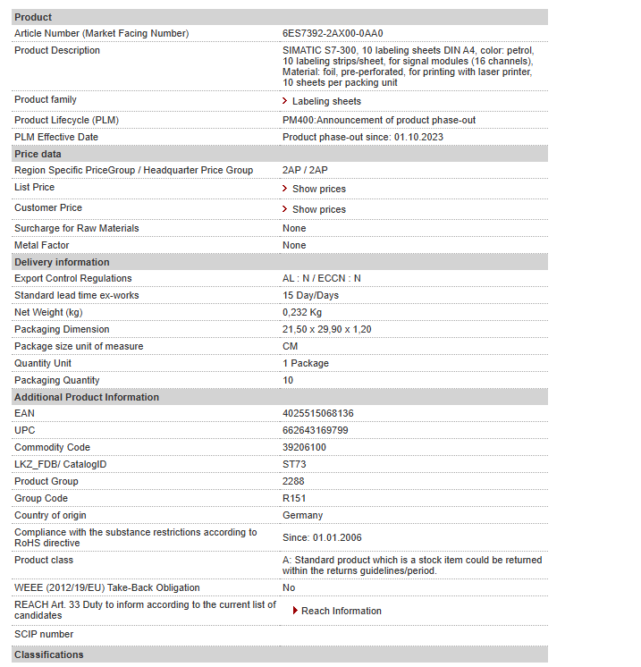 | SIMATIC S7-300, 10 labeling sheets DIN A4, color: petrol, 10 labeling strips/sheet, for signal modules (16 channels), Material: foil, pre-perforated, for printing with laser printer, 10 sheets per packing unit |