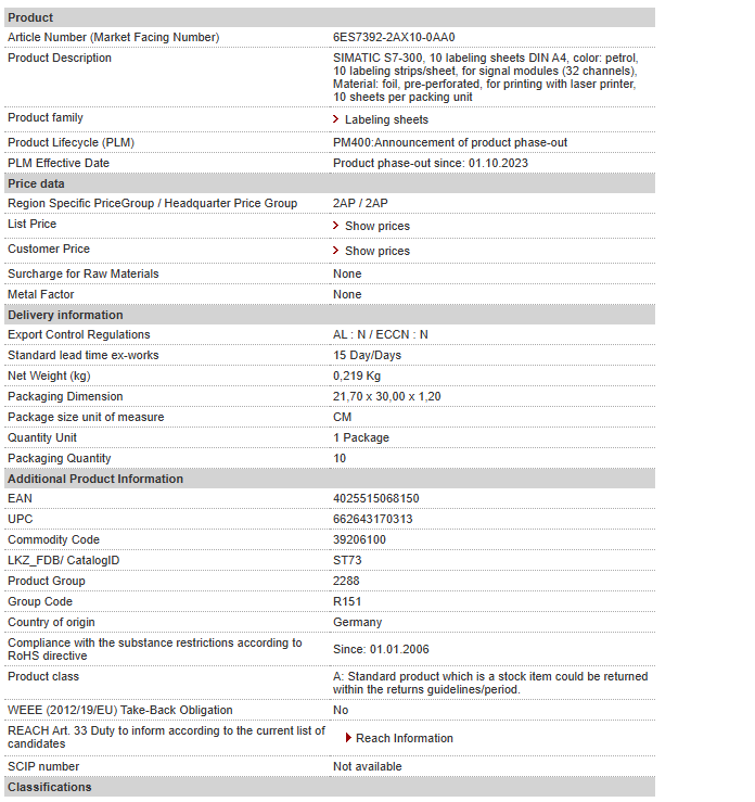 | SIMATIC S7-300, 10 labeling sheets DIN A4, color: petrol, 10 labeling strips/sheet, for signal modules (32 channels), Material: foil, pre-perforated, for printing with laser printer, 10 sheets per packing unit |