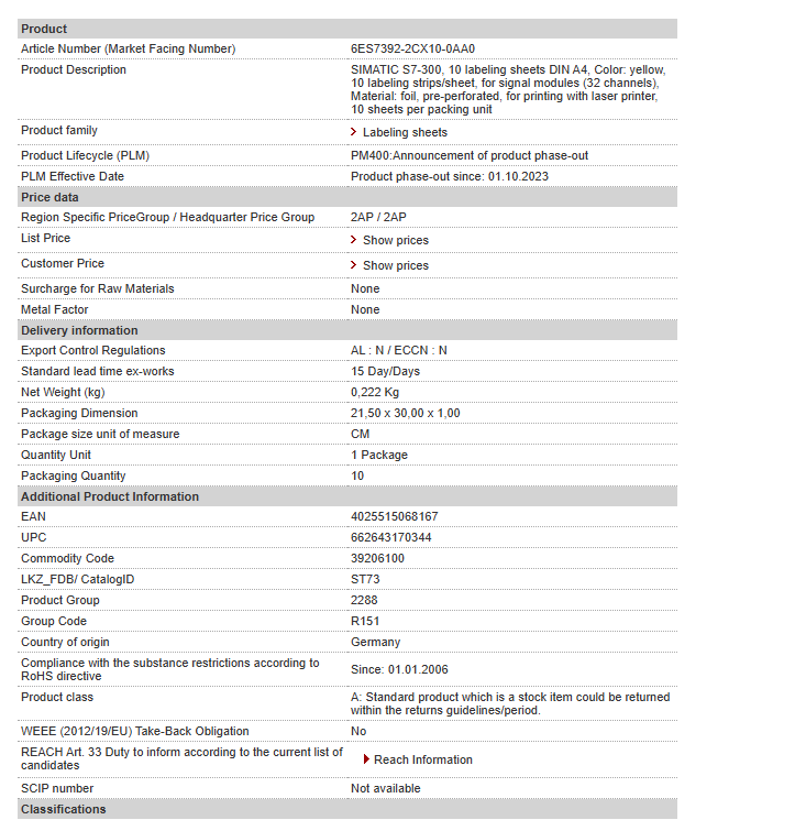 SIMATIC S7-300, 10 labeling sheets DIN A4, Color: yellow, 10 labeling strips/sheet, for signal modules (32 channels), Material: foil, pre-perforated, for printing with laser printer, 10 sheets per ……