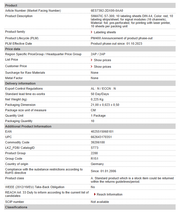 SIMATIC S7-300, 10 labeling sheets DIN A4, Color: red, 10 labeling strips/sheet, for signal modules (16 channels), Material: foil, pre-perforated, for printing with laser printer, 10 sheets per pac……