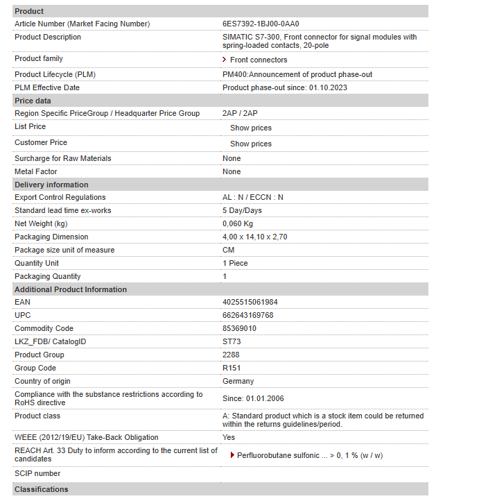 | SIMATIC S7-300, Front connector for signal modules with spring-loaded contacts, 20-pole |