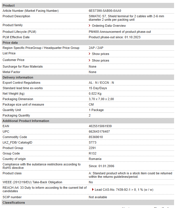 | SIMATIC S7, Shield terminal for 2 cables with 2-6 mm diameter 2 units per packing unit |