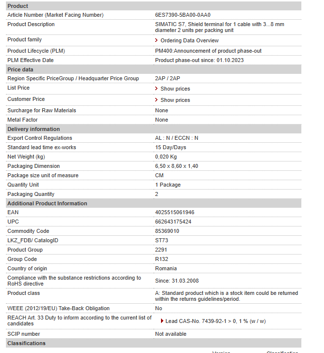 | SIMATIC S7, Shield terminal for 1 cable with 3…8 mm diameter 2 units per packing unit |