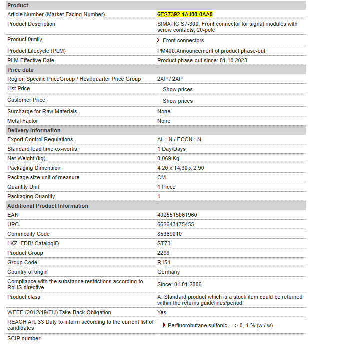 | SIMATIC S7-300, Front connector for signal modules with screw contacts, 20-pole |