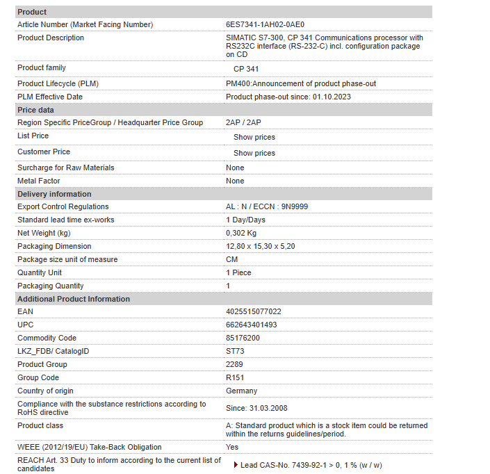 | SIMATIC S7-300, CP 341 Communications processor with RS232C interface (RS-232-C) incl. configuration package on CD |
