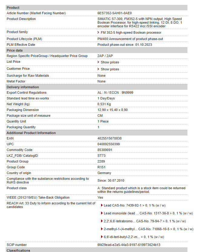 | SIMATIC S7-300, FM352-5 with NPN output, High Speed Boolean Processor, for high-speed linking, 12 DI, 8 DO, 1 encoder interface for RS422 incr./SSI encoder |