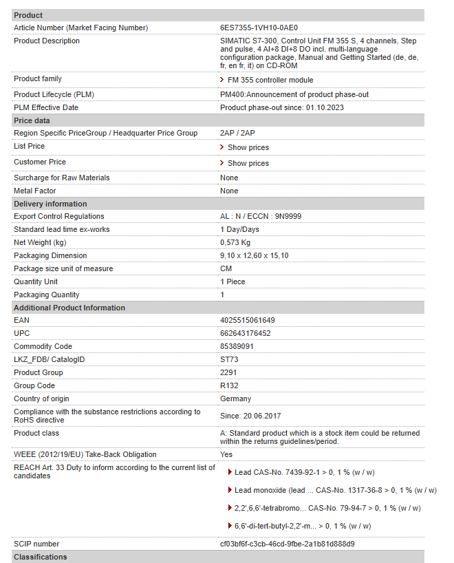 | SIMATIC S7-300, Control Unit FM 355 S, 4 channels, Step and pulse, 4 AI+8 DI+8 DO incl. multi-language configuration package, Manual and Getting Started (de, de, fr, en fr, it) on CD-ROM |