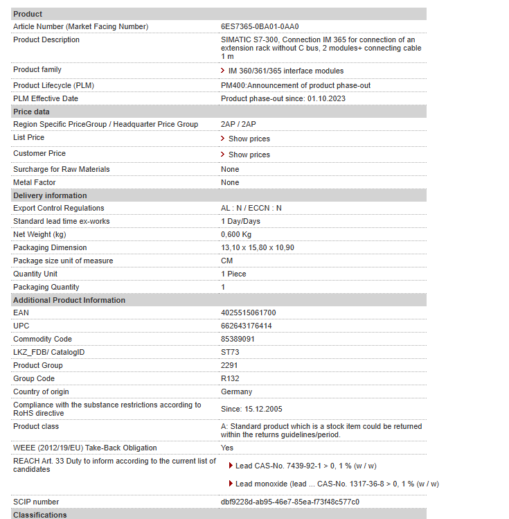 | SIMATIC S7-300, Connection IM 365 for connection of an extension rack without C bus, 2 modules+ connecting cable 1 m |
