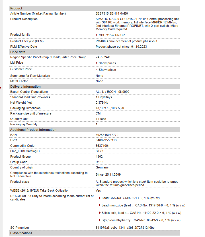 | SIMATIC S7-300 CPU 315-2 PN/DP, Central processing unit with 384 KB work memory, 1st interface MPI/DP 12 Mbit/s, 2nd interface Ethernet PROFINET, with 2-port switch, Micro Memory Card required |