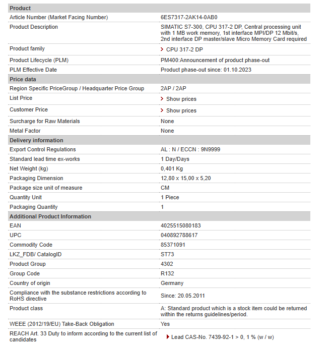 | SIMATIC S7-300, CPU 317-2 DP, Central processing unit with 1 MB work memory, 1st interface MPI/DP 12 Mbit/s, 2nd interface DP master/slave Micro Memory Card required |