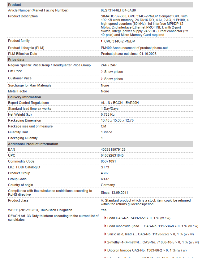 SIMATIC S7-300, CPU 314C-2PN/DP Compact CPU with 192 KB work memory, 24 DI/16 DO, 4 AI, 2 AO, 1 Pt100, 4 high-speed counters (60 kHz), 1st interface MPI/DP 12 Mbit/s, 2nd interface Ethernet PROFINE……