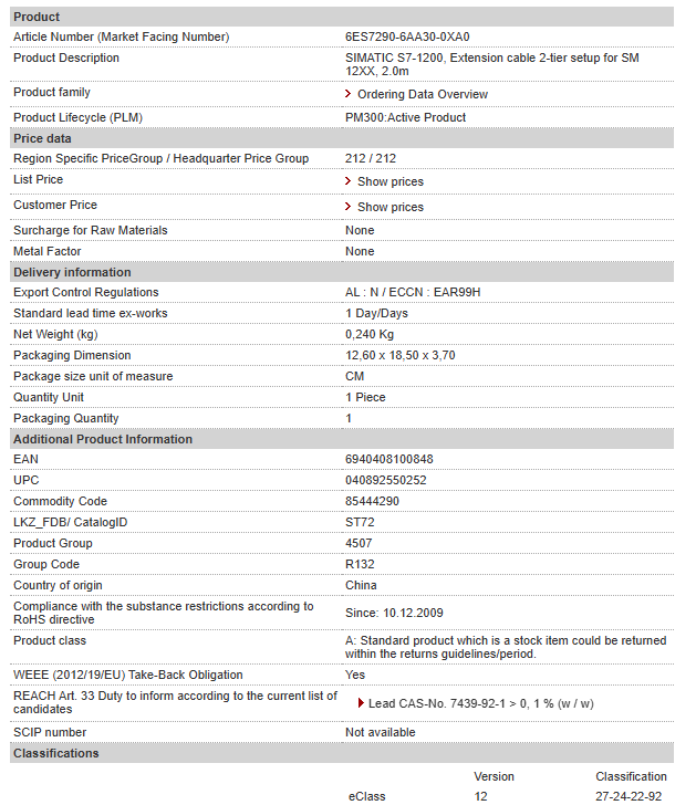 | SIMATIC S7-1200, Extension cable 2-tier setup for SM 12XX, 2.0m |